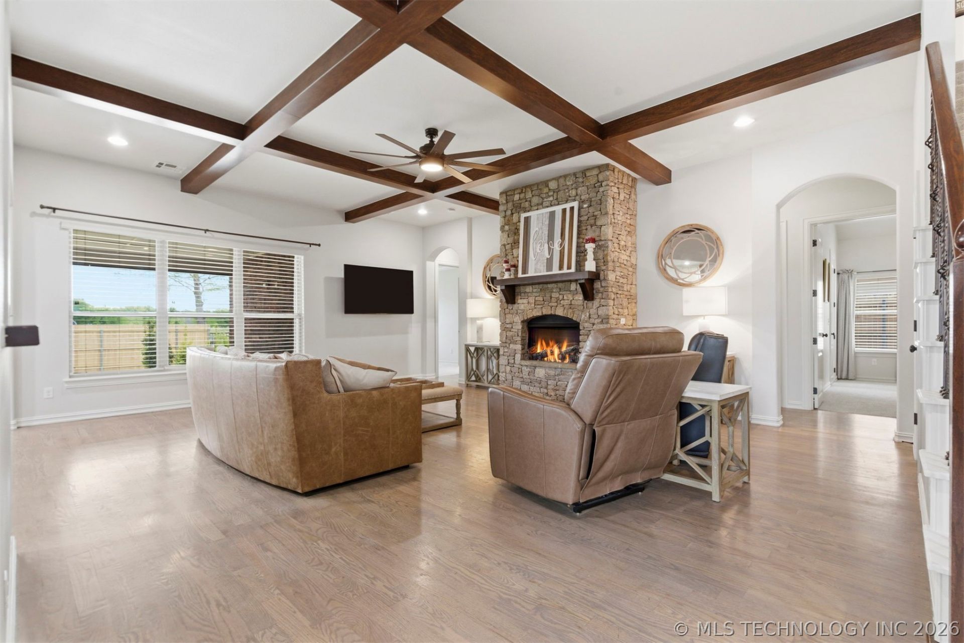 Step into this stunning 5 bedrooms 3.5 bath home designed for both comfort and style. The spacious living area welcomes you with vaulted beam ceilings and a stone-stacked fireplace - great for relaxing or entertaining. The kitchen features granite countertops, a large island with seating, a butler's pantry and a walk-in pantry, all flowing into a formal dining room. A dedicated office space for work or study. High ceilings and wood floor enhance the downstairs. The master suite offers a pan ceiling and backyard access. Master bath w/double sinks and separate shower. All bedrooms with walk-in closets. Upstairs game room with wet bar & over sink cabinet. Beautifully landscaped! Backyard access to fountain, play area and walking trails. Recent updates include downstairs AC ('25); upstairs AC ('26); Navis Tankless Water Heater ('25)' Roof ('26); Master, stairs and downstairs bedroom w/new carpet ('26)' Upstairs carpet and 1 guest room ('21); Fence replaced ('26). This home blends function and modern updates - ready for you to move in and make it your own.